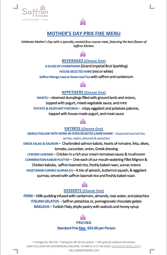 Reserve a tableFor ages, the silk road has acted as a conduit of, cultures, commerce, & food/spices throughout all its varying regions. Saffron Kitchen offers a comfortable yet casual dining experience, providing the rich flavors of Afghanistan, infused with a delightful Mediterranean flavor. Our menu is a delicate balance between age-old flavors and modern-day culinary excellence. We offer fresh, nourishing, dishes, using local ingredients that are seasonally available, complimented by an extensive assortment of premium wines and microbrewery beers and spirits.